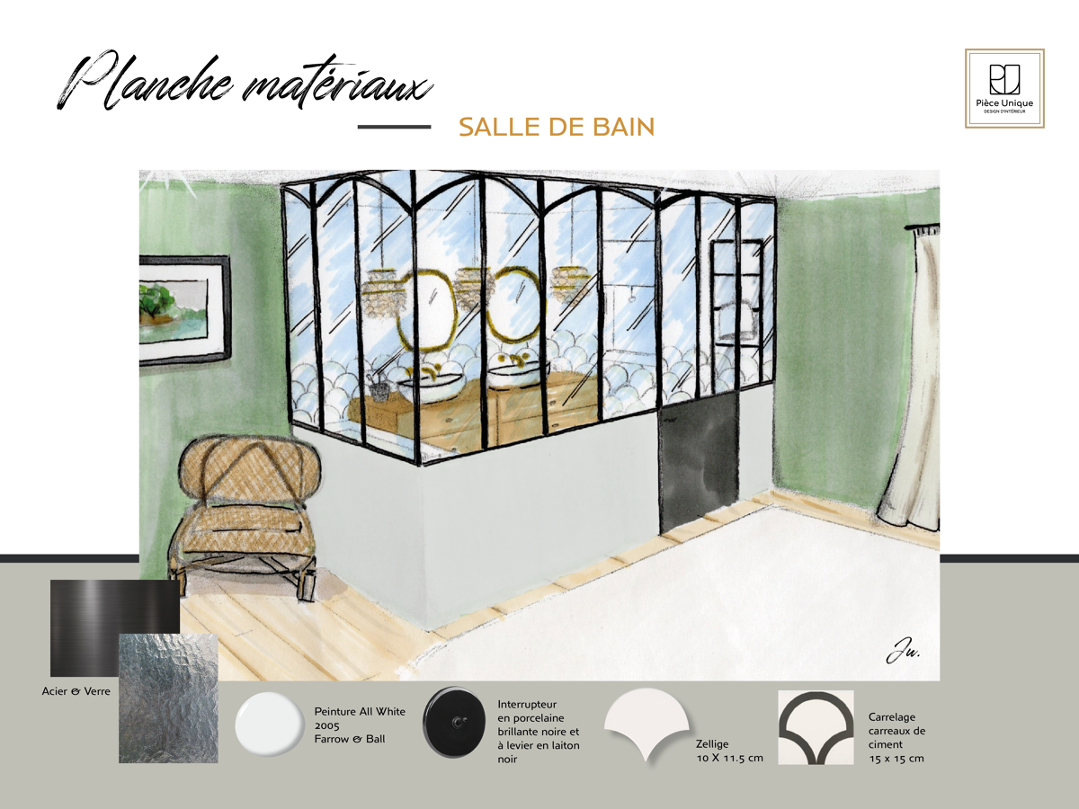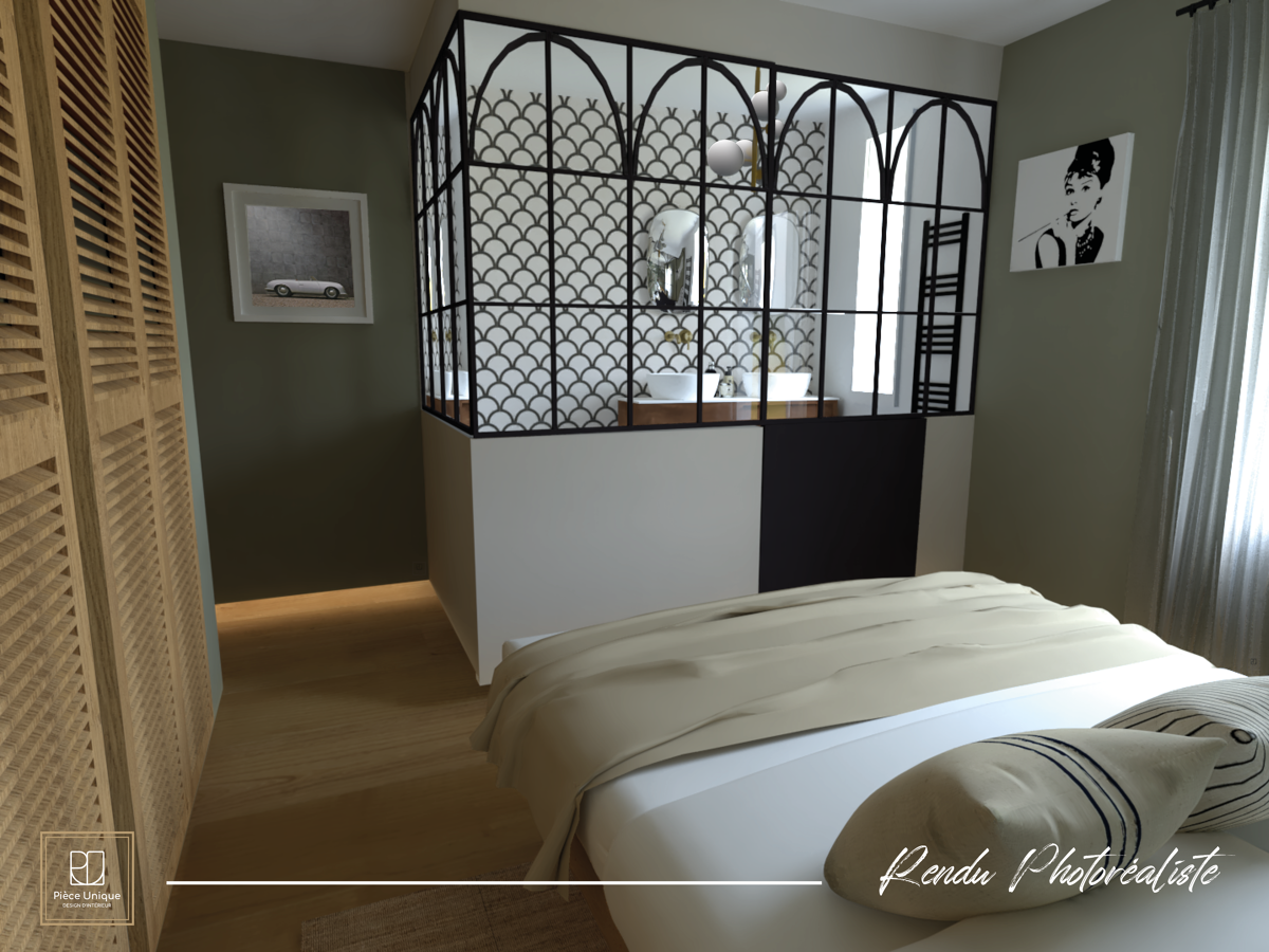 L'objectif était d'intégrer, dans une chambre parentale de 18 m2, une salle de bain de 6 m2. Pour garder la notion d'ouverture, propre à l'ensemble de la maison et pour laisser entrer la lumière et donner ainsi une impression d'espace plus grand, j'ai proposé de délimiter la salle de bain attenante à la chambre par une verrière métallique. L'esprit art déco et le style contemporain jouent l'harmonie parfaite. Dans la salle de bain, le sol fait écho aux montants noirs et au style art déco de la verrière. Pour la partie nuit, le vert, couleur apaisante et sereine, est omniprésent. La tête de lit est soulignée d'un papier peint représentant la nature. Une ambiance reposante, parfaite dans une chambre !