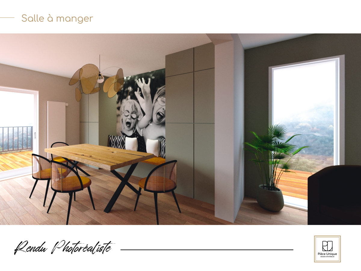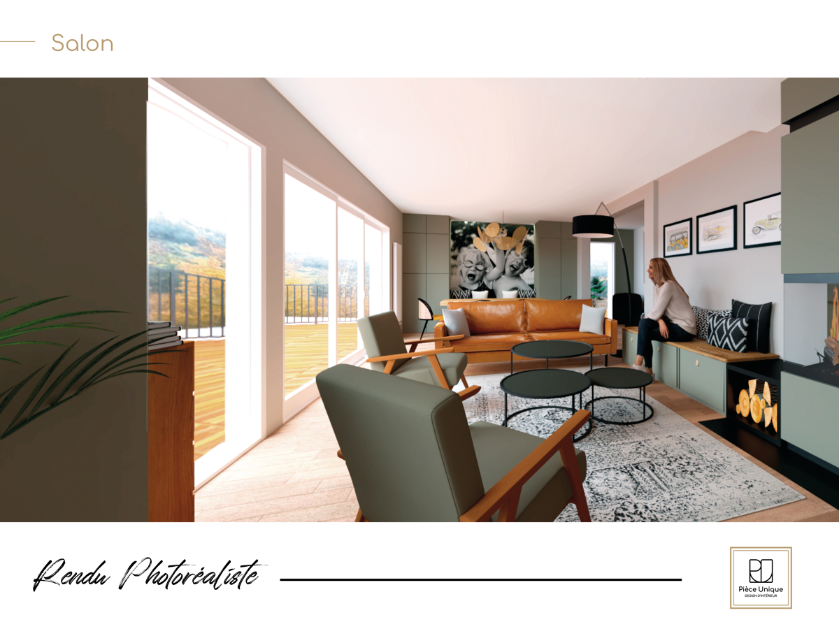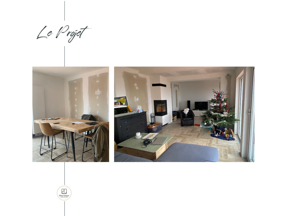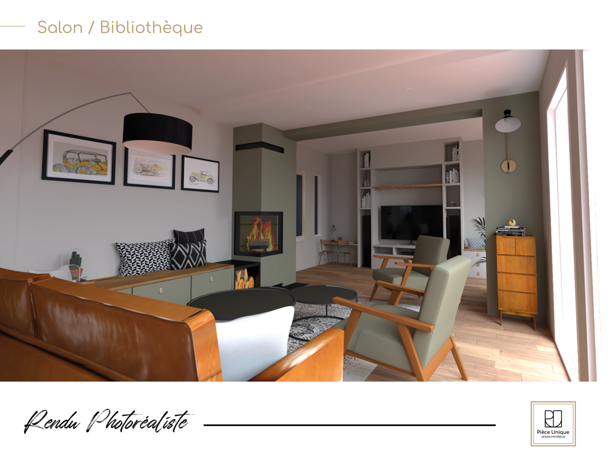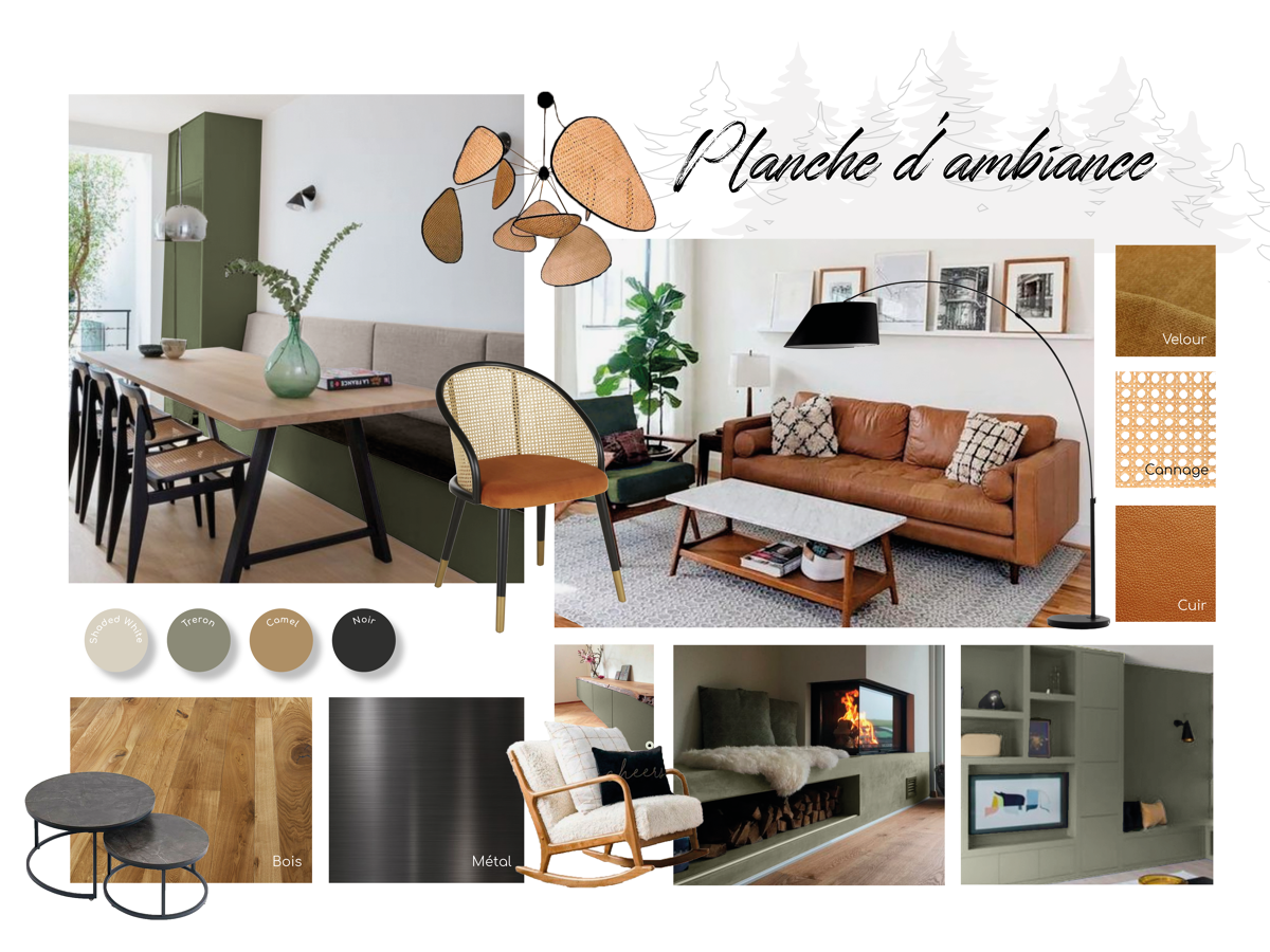 L’objectif dans ce projet était que mes clients se projettent dans différentes possibilités d’aménagements et ainsi qu’ils puissent faire le choix des matériaux, des couleurs, de l’angencement possible et de la décoration. Pour composer cette ambiance, l’idée a été de partir d’un style de décoration tendance et chic où l’on compose avec les meubles aux formes caractéristiques du retro (un fauteuil rétro, un buffet d’occasion au style ancien, un canapé au pieds compas) et d’y associer des objets du passé chinés ou au style vintage (luminaires, tapis, etc.) le tout réhaussé d’une couleur zen.