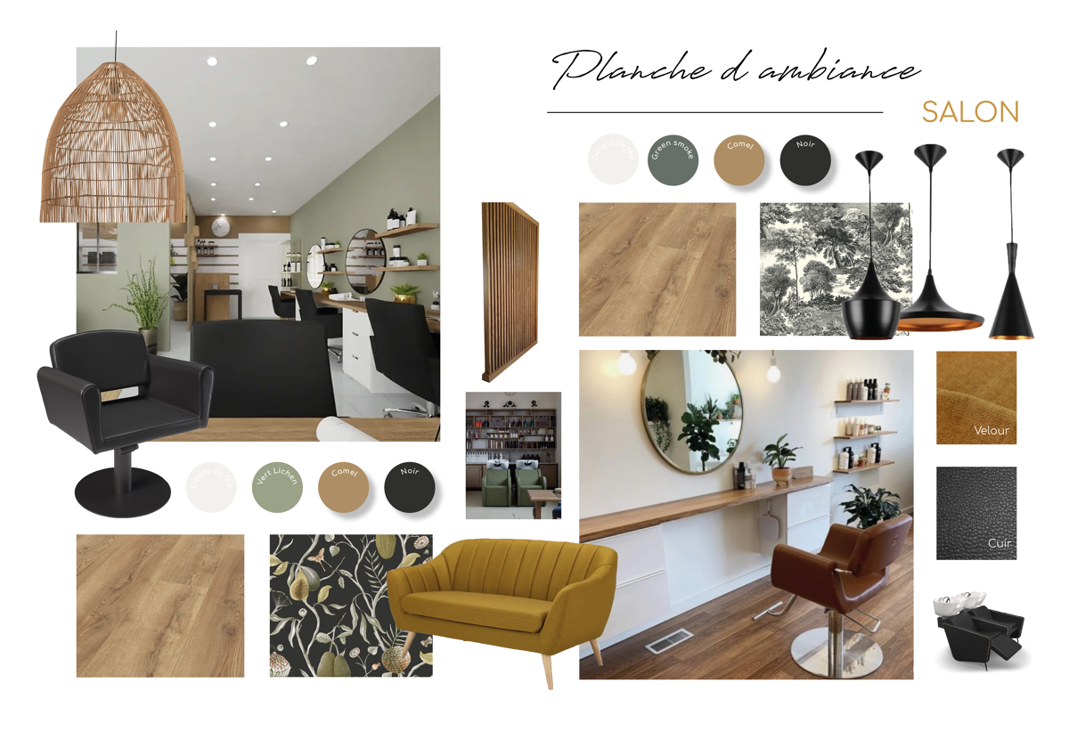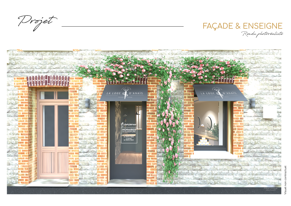 Conseils esthétiques et techniques pour la façade et l’enseigne d’un salon de coiffure, l’aménagement intérieur et la conception décorative d’un salon de coiffure d’une superficie d’environ 39 m2 et création d’une identité visuelle (logo).
