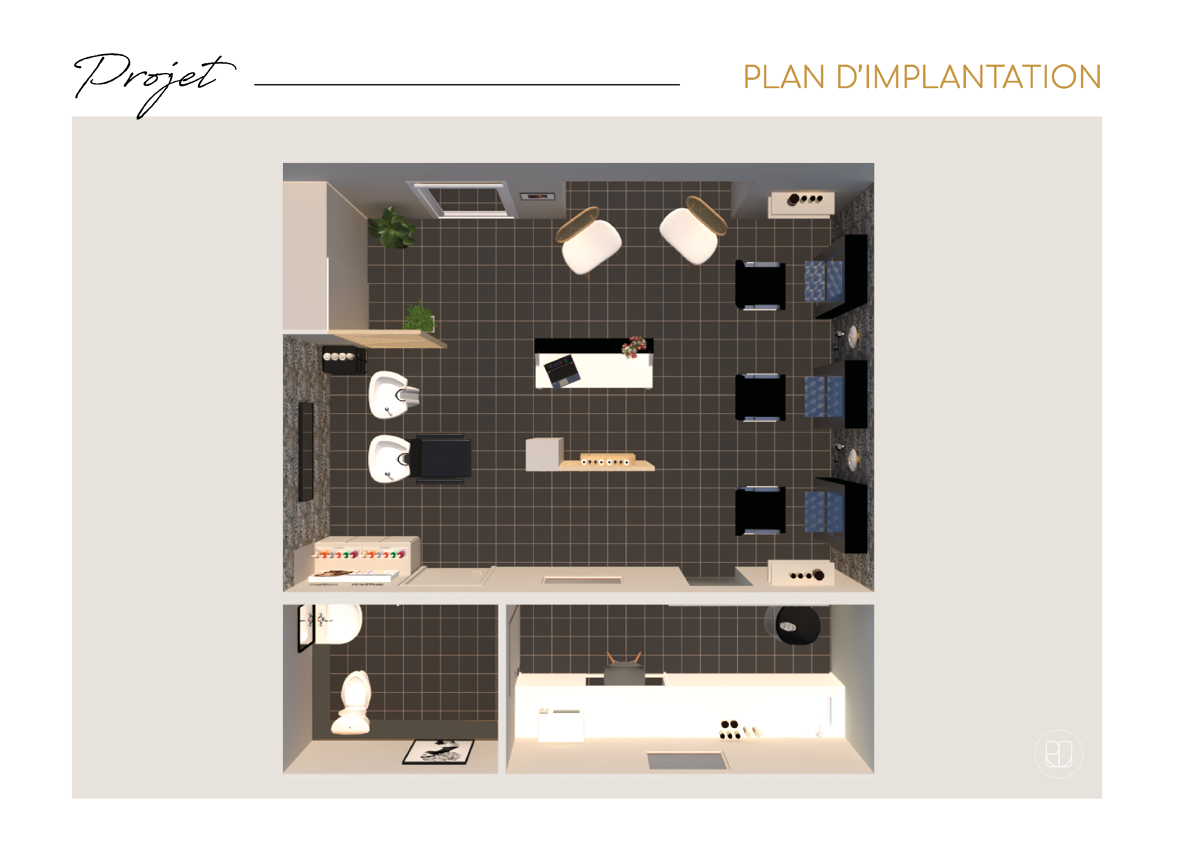 Ma cliente, changeant de local, souhaitait aménager ce nouvel espace tout en réutilisant le mobilier de son ancien salon. L’objectif du projet a été d’étudier les possibilités esthétiques et techniques afin de valoriser les différents espaces, conseiller sur le choix des matériaux, des couleurs, de l’agencement et du mobilier et renforcer sa visibilité et son attractivité commerciale.